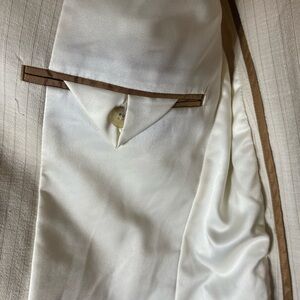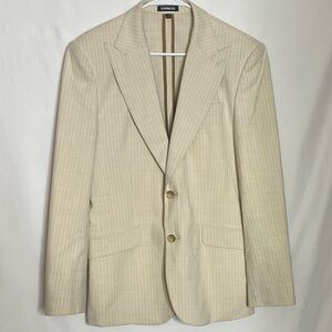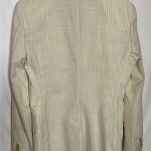 Stylish beige blazer with subtle stripes. Ideal for formal events. Features two-button design.
