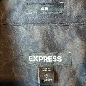 The product is an Express Men's Dress Shirt in a stylish black floral print, featuring a slim fit and long sleeves. Made from cotton with a dark fabric wash, this collared shirt is perfect for a summer floral theme. The shirt is machine washable and has a button closure, spread collar, and a neck size of 16.5 inches. This dress shirt is a versatile and fashionable addition to any man's wardrobe, ideal for both formal and casual occasions.