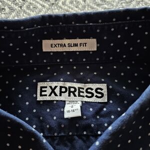 Dress sharp with this Express Extra Slim Fit long sleeve shirt featuring a timeless navy blue base with subtle white polka dots. This versatile button-up is perfect for office wear, date nights, or elevated casual looks.