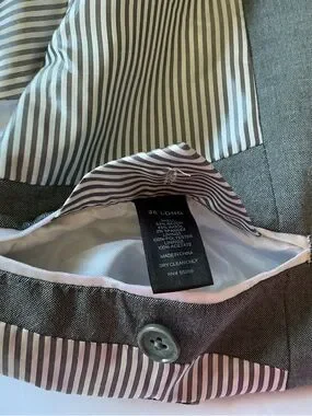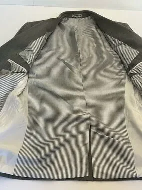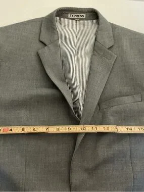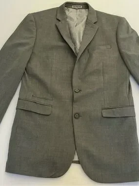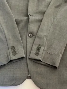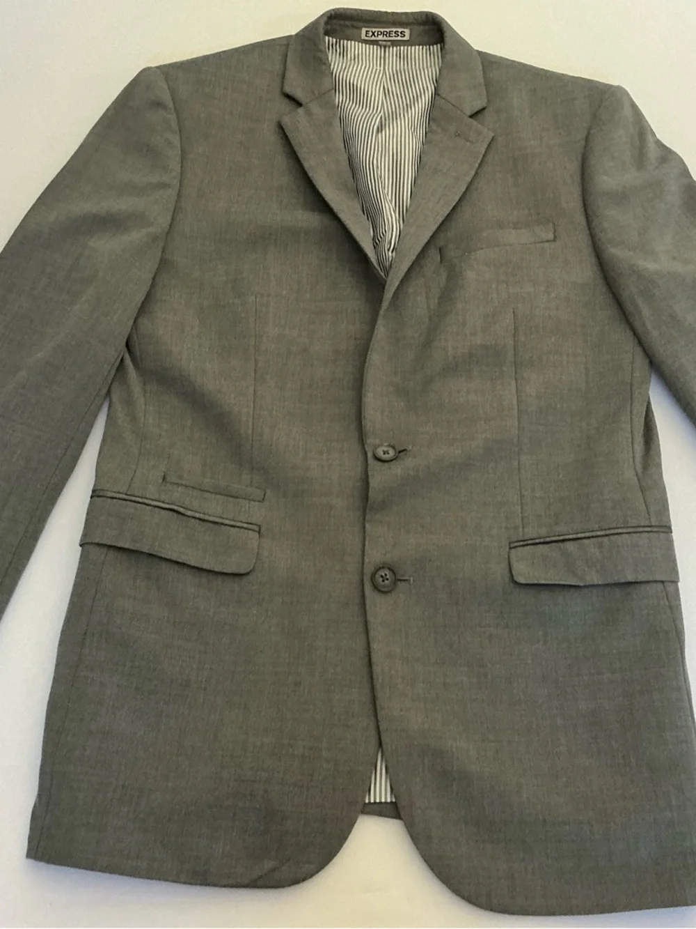 Tailored men's blazer from Express. Two-button front with notch lapel. Front flap pockets and chest welt. Subtle textured gray fabric for versatile wear.