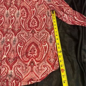 Elevate your wardrobe with this bold and stylish button-down shirt from Express. Featuring a rich red base and an intricate paisley pattern in black and white, this eye-catching piece is perfect for both casual and dressy occasions. Whether you’re heading out for a night on the town or looking to stand out at an event, this shirt delivers personality and polish.