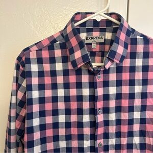 Express Men's Pink and Navy Plaid Button Down Shirt Size Large (16-16 1/2)