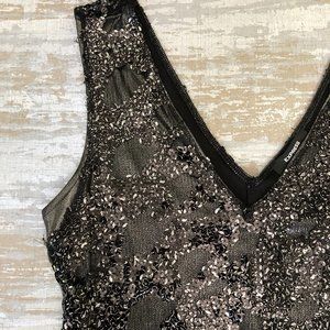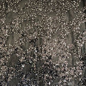 Dark grey metallic fabric with black/metallic sequence overlay. V neck front and V back detail.