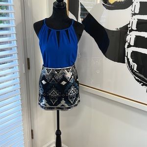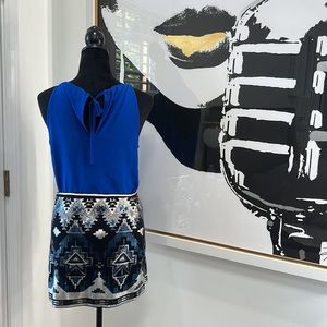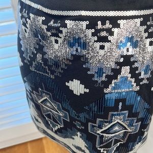 Like new and in Excellent Condition. Stunning sequin mini skirt features an Aztec inspired print in metallic shades of silver, gray and teal. Perfect for a girls night out or a date night with that special someone. The material is stretchy and fitted. The lining is soft and silky.
