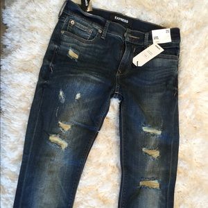 NWT. Express Mid Rise Stretch Distressed Jean Legging. Dark Wash. These are SHORT in length.