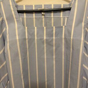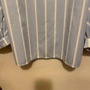 New with Tags! Blue blouse with white and yellow or tan stripes. Never worn before. It is not necessarily a crop top, but it is more like a mid-top. In GREAT condition. Great for the summer. Has poofy sleeves. Great to wear with pants or a skirt. Material listed as 67% cotton, 29% polyester and 4% spandex. Measurements can be found below: