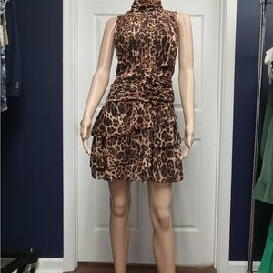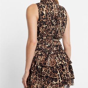 Leopard Print Mock Neck Ruched Waist Tiered Mini Dress