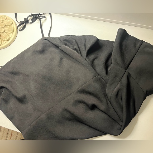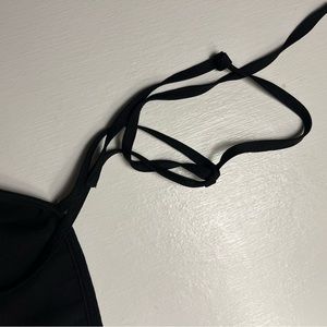 Title black mini dress. Smocked back. Ruffle hem. Adjustable tie straps