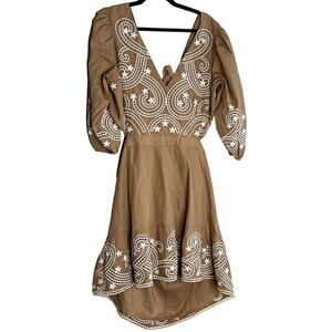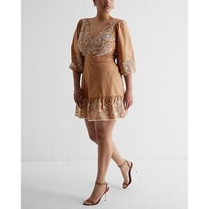 Express Mini Dress Women Size XL Brown Tan Cotton Back Poplin Embroidered Eyelet V-Neck Tie Back Popline Retail $118 NEW Romantic Cottagecore Boho Bohemian Coquette