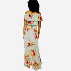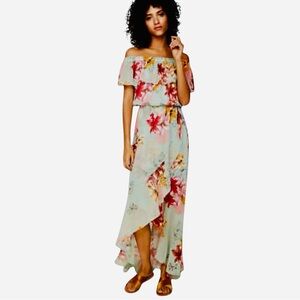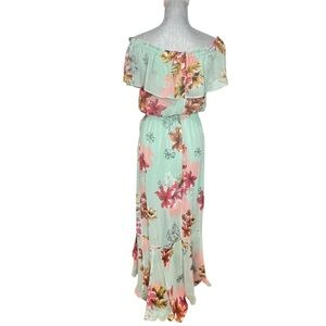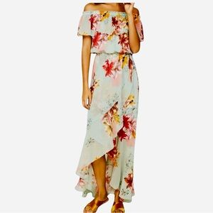 Brand: Express Details: Mint Green tropical floral print, off the shoulder style, cascading ruffle tiered wrap over skirt Elastic waist, Creped Chiffon , High Low, Maxi dress, lined above the knee, Colors: Pastel minty green with dusty red, peach, yellow print flowers Condition: Excellent pre owned -no visible flaws Size XSmall Fabric: 100% polyester Smoke free home Offers welcome!