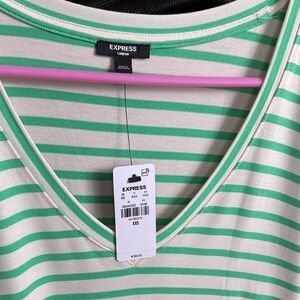 Chic mint and white striped V-neck tee. Ideal for everyday wear. Loose fitting