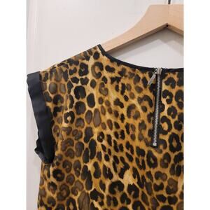V-neck Cap sleeve blouse with contrast black sleeves. Pullover mobwife leopard print blouse. Exposed back zipper with silver hardware. Rounded hi-low hem. Perfect under a blazer or pair with jeans for an elevated casual look.