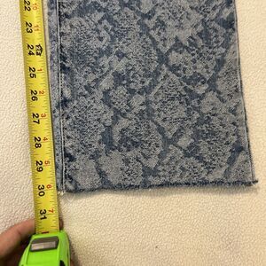 The product is a pair of Express Women's Size 8R jeans in a modern straight high rise fit with a snakeskin design. Made of cotton denim in a solid blue color, these jeans feature a zip and button closure and a 5-pocket design. Machine washable and with a high rise waist, these jeans are perfect for any season and offer a chic and stylish look for any woman's wardrobe. The brand, Express, ensures quality and fashion-forward design in this versatile and on-trend piece of clothing.