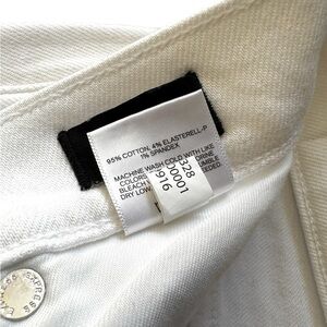 A classic white jean for Summer fun. These super high rise, slim fitting, tapered straight leg jeans have a 5 button fly closure and 5 pockets.