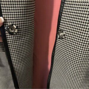Chic houndstooth jacket by Express. Features an elegant open front and classic design. Faux leather trim