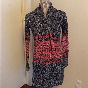 Gorgeous Express multi print cardigan sweater, no zipper or button closure, size small. Two front pockets, cozy and comfy, in good pre loved condition.
