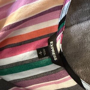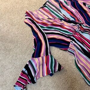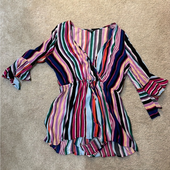 Bright striped romper with a V-neck. Lightweight, flowy fabric. Elastic waist for shape. Three-quarter sleeves.