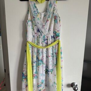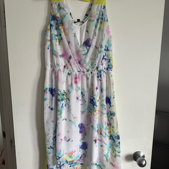 Express dress with a vibrant abstract design. Features a mix of colors for a bold style.