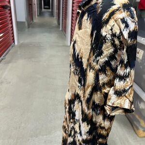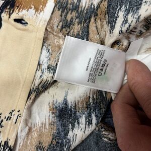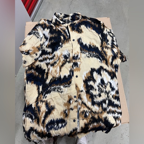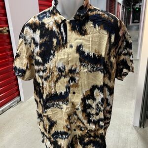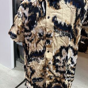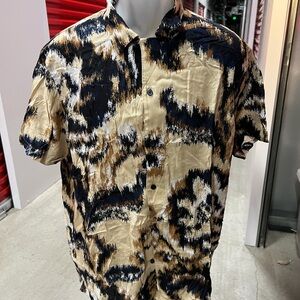 Chic shirt with abstract design. Features black, tan, and cream tones.