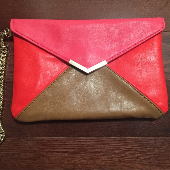 Super cute multi color envelope clutch with gold snap button closure and removable gold wrist chain. Originally purchased from Express. No signs of wear.
