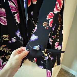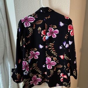 Elegant jacket with vibrant floral design. Perfect for adding flair to any outfit like a black dress or jeans. The ends on the sleeves is bow tied which makes it really feminine
