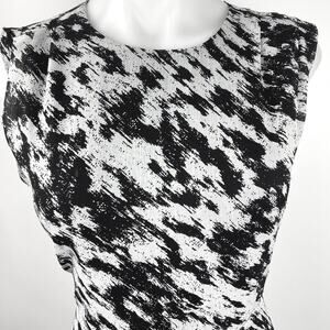 Express Multicolor Crew neck Sleeveless Pleated shoulders Ruching detail around waist Asymmetrical tiered ruffle hem Mini length Metallic abstract print Lined Dress S