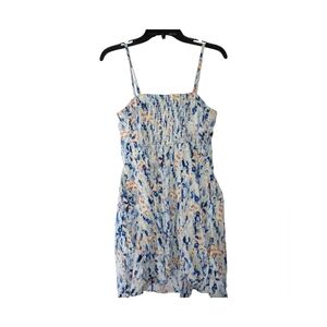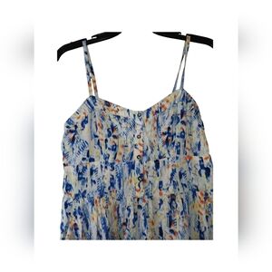 Vibrant dress with multicolor pattern. Features blue, red, and yellow hues.