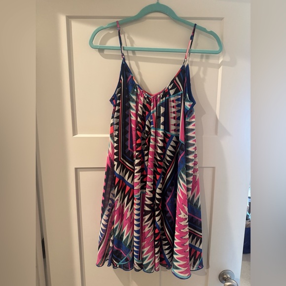 Chic dress with multicolor patterns. Features shades of blue, pink, and orange. Ideal for a stylish statement.
