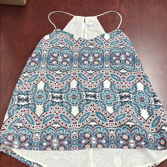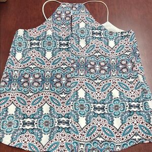 Stylish halter top with intricate patterns. Features a mix of blue, red, and white colors. Perfect for casual outings.