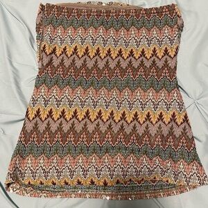 Beautiful tube top with a vibrant multicolor pattern. Zipper on the side. Features intricate designs in brown, green, light pink, and yellow. Sequins on the front with a subtle sheen. Personally, I really love this top, but it’s gotten too small on me : ( In great condition!