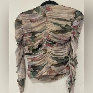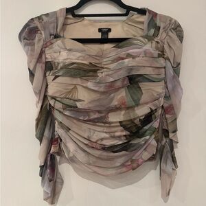 Chic ruched blouse with floral design. Features a square neckline and long sleeves. Ideal for stylish outings.