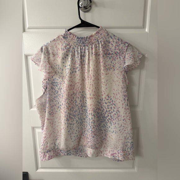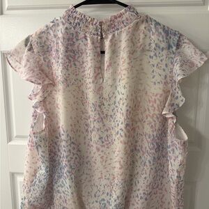 Chic ruffle sleeve top. Features a multicolor pattern. Lightweight and stylish.