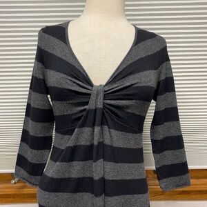NWT Express Black and Gray Striped Wool Blend Twist Front Sweater Dress with a v-neck and 3/4 length sleeves
