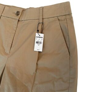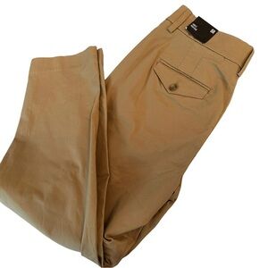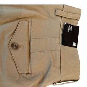 Cotton with stretch. Crisp fabric. Pleated. Diagonal slit pockets. Button and zip closure. Khaki.