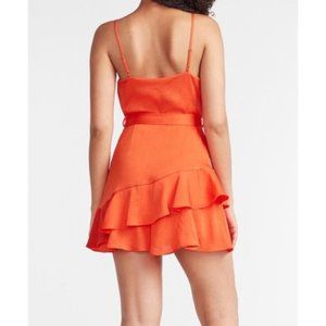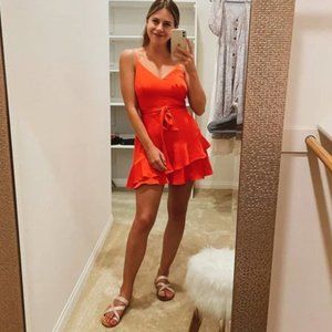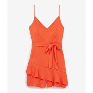 Ruffle Wrap Front Skort Romper by Express in Coral, a vibrant orange-pink color. Size S.