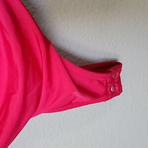V neck and V back. 2 button snap closure at the bottom. Stretchy. Vibrant pink. Ruched at the sides and at the shoulders. coquette, girly, feminine, going out, dopamine, concert, summer, spring, festival, barbiecore, sexy, tight, boujee, baddie, date