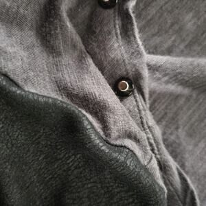 Express t-shirt FEATURES an NYC Rodeo spell out graphic across the front and studs on the neckline. Faux leather black short sleeves. Round neck. Stretchy jersey knit fabric.