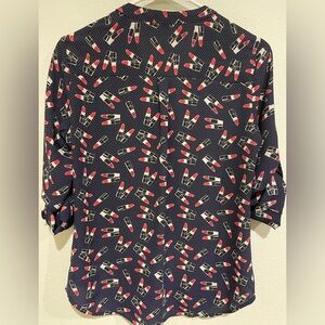 Express Navy Blue and white polka dot blue blouse with lipstick novelty print. Zip quarter zip. Tab sleeves.