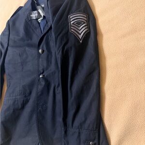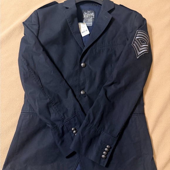 Stylish navy military jacket. Features button closure and shoulder patch detail. Perfect for a classic look.