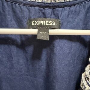 Elegant navy dress with white accents. Features a wrap style and ruffled details. Romper style. Worn once. Like new.