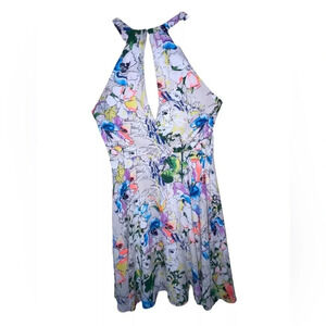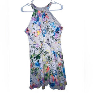 Express Neon Watercolor Floral Dress A Line Halter-neck Size 8 Skater Preppy Summer