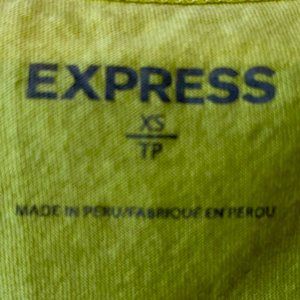 Tank top from Express made from a fun neon yellow knit fabric in a size extra small (XS). The top features a scoop neck, one breast pocket with subtle decorative stitching, and a rounded hem.