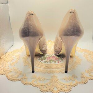 These beautiful nude color peep toe pumps are the perfect neutral high heel! Although the heel is 5" there is a 3/4" platform under the toe box and the inner sole is beautifully cushioned in gold. Worn only once so only minor scuffing on sole. They are surprisingly comfortable for this heel height. Wear with just about anything in its beautiful taupey nude patent leather, pair them up with jeans, a pencil skirt, form fitting dress and you are ready for date night, dinner out, party celebrations or even for work! You will strut your stuff in high heel style in these beautiful pumps from Express!