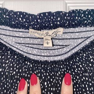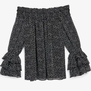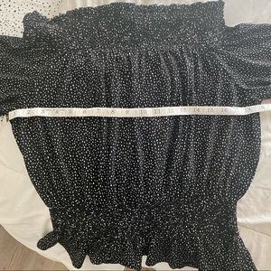 Black and white pattern/dot off the shoulder top with ruffle sleeves. Ruffle sleeves are subtle. Elastic band on waist which makes the top come in instead of being too billowy, very flattering.