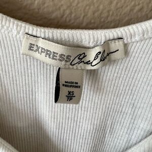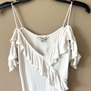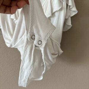 White ruffle ribbed bodysuit by Express! Off shoulder. Thong style. Button snap closure. Size XS. In good condition!