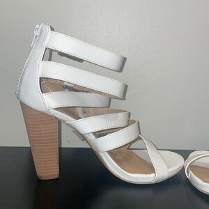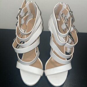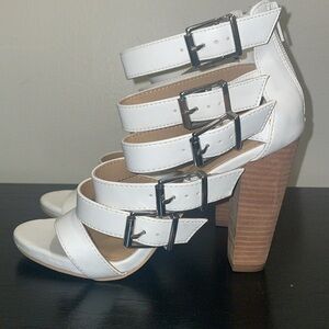 Express Off White Faux Leather Block Sandals w 5 buckles & back zippers. SZ 9