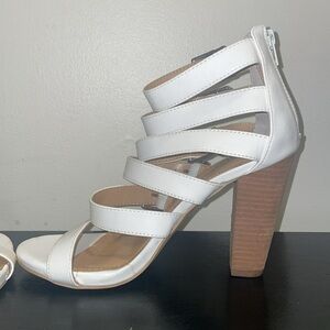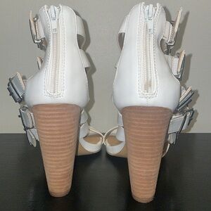 Sexy. Date Night. Approx 4.5” Heels. Chunky Heels. Silver Buckles. Faux Leather. Off white. Wedding Attire. Club. Girls Night Out. Classy. Touch of Flare.