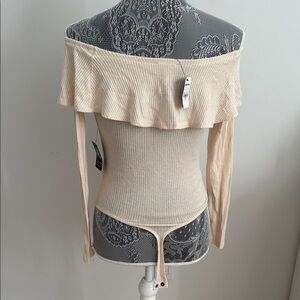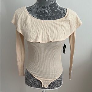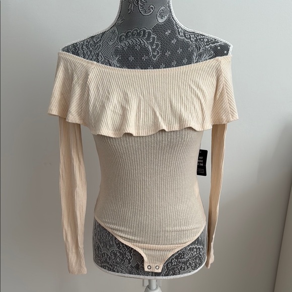 Stylish off-shoulder bodysuit with ribbed texture. Features a ruffle neckline and long sleeves. Perfect for a chic look.