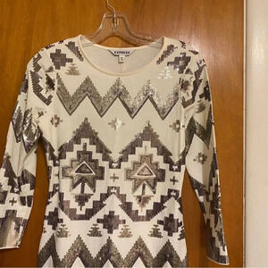 Express Off-White and Silver Mixed Sequins 3/4 Sleeve Stretch Body-Con Dress, Size X-Small