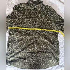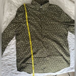 Stylish olive shirt with floral pattern. Button-down design. Perfect for casual outings. Stretch